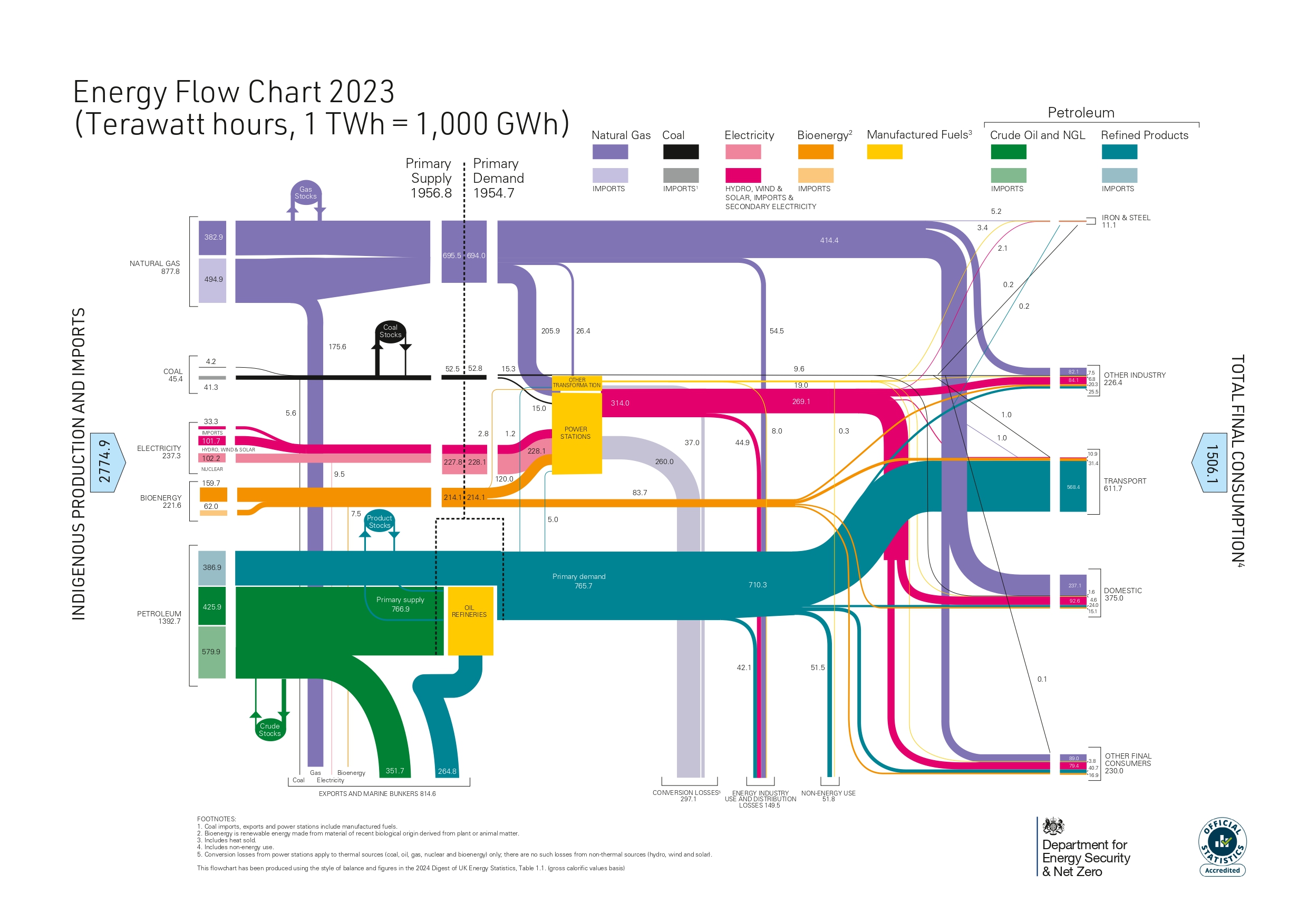[Please Note Regarding Energy Flow Chart: data from 2023 - 2024 will be available after 31st July 2025 - Department of Energy and Net Zero.] We are unsure as to why the Dept Energy & Net Zero should take 8 months to gather this data - so here is the USA version - which is very simialar in structure {Click HERE to see USA Chart - in a not so attactive format}